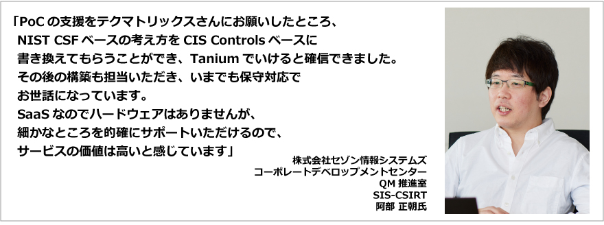 ゼロトラストネットワークへの移行に伴い、グローバルなネットワーク環境を見直し、Taniumを全世界の脆弱性対策プラットフォームとして展開したい。