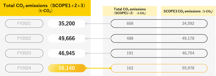 The Company has set a target of reducing the Group’s GHG emissions by 46% by FY2030 (relative to the FY2020 level) and reaching net zero (covering Scope 1 and Scope 2) for all GHG emissions from business activities by 2050. We will strive to grasp an overall picture of emissions not only by the Company itself but by the Group’s supply chain and to set targets for their reduction. Further, we will participate in climate change-related initiatives such as SBT and CDP and cooperate with suppliers on global climate change countermeasures.