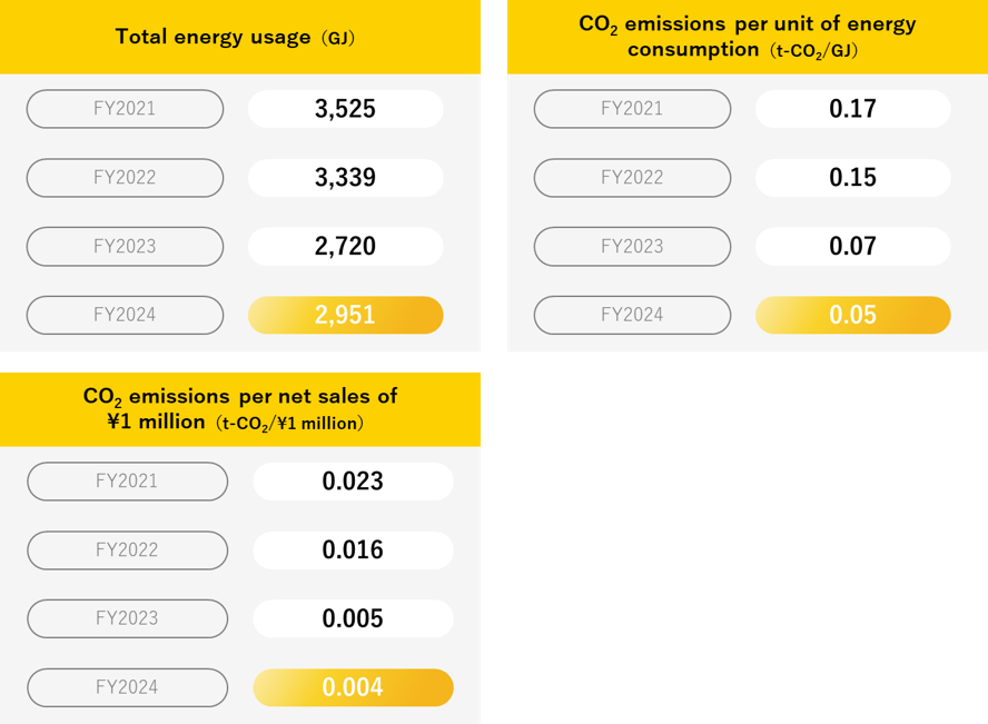 Greenhouse gas emissions from the Company’s business activities are attributable to electricity and gas used at business sites. For this reason, we will switch electricity used at business sites to renewable energy and set aside the funds necessary to purchase J-Credits, Green Energy Certificates and Non-Fossil Certificates, as well as engage in steady and continuous activities to achieve carbon neutrality.