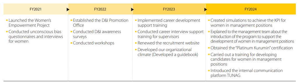 With this recognition, we seek to ensure that more diverse people are able to thrive in our organization under our D&I slogan of “Recognizing Differences, Driving Individuality.” In particular, to enhance the diversity of our managers, we are working to develop female manager candidates. We believe that having manager-level staff with diverse perspectives and beliefs drive the organization forward will generate new ideas and values and lead to the evolution of the Company.