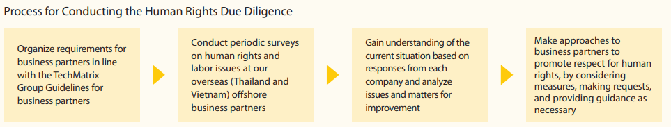 In line with the guidelines set forth by the TechMatrix Group for its business partners, we conduct periodic surveys on human rights and labor issues at our overseas (Thailand, Vietnam) offshore business partners after organizing requirements for business partners.