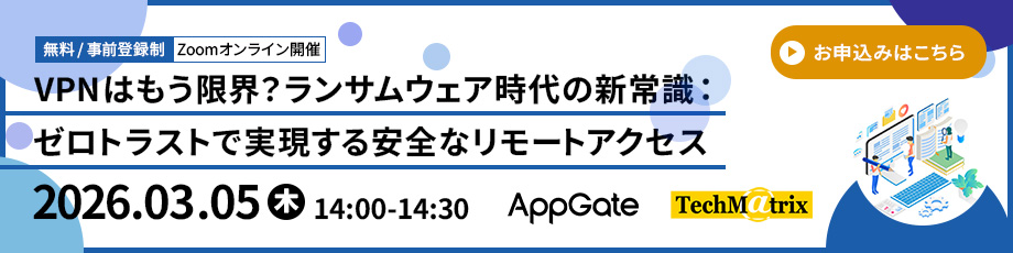 そこで本セミナーでは、ゼロトラストの考え方を取り入れ、より安全で柔軟なリモートアクセスを実現する「ZTNA(Zero Trust Network Access)」について解説します。さらに、VPNリプレイスで多数の実績を誇る『Appgate ZTNA』を事例とともにご紹介し、導入のポイントをわかりやすくお伝えします。