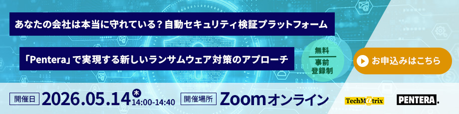 2026年1月に開催した「あなたの会社は本当に守れている?自動セキュリティ検証プラットフォーム「Pentera」で実現する新しいランサムウェア対策のアプローチ」と題するオンラインセミナーを、2026年5月14日(木)に再配信いたします。