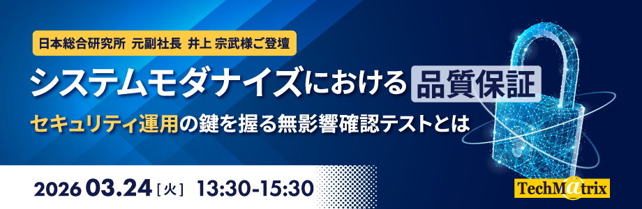 本セミナーでは、株式会社ディプラネット 井上様をお招きして、モダナイズにおける品質保証の重要性を解説します。さらに、多くの企業が定める「セキュリティパッチ適用」が守られない現状と、海外当局からの要請が強まる背景を紹介し、無影響確認テストの自動化こそが安全な運用と迅速なパッチ適用を両立する鍵であることをご紹介します。セミナーの後半には、テクマトリックスよりシステムモダナイズに関するセッションを開催予定です。