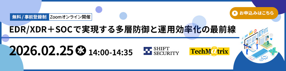 | 14:00~14:10 | なぜEDR/XDRは「導入しただけ」では回らないのか ——現状と運用課題の整理 テクマトリックス株式会社 ネットワークセキュリティ事業部 第3営業部 野村 修也 EDR/XDRは導入が進む一方で、アラート過多や誤検知、運用負荷の増大といった新たな課題も顕在化しています。本講演では、複数製品を利用する企業で特に起こりやすい運用上の課題を整理し、次の解決ステップへの前提を共有します。 |