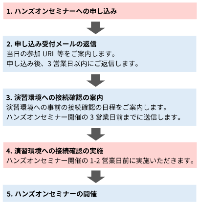 | 注意事項 | 本セミナーでは、Amazon WorkSpacesにセットアップされたSOAtest/Virtualizeを利用して、演習を実施いただきます。Amazon WorkSpacesへの接続に関しては、お申し込み後にお送りする受付状況のご連絡メールにて、ご案内します。Amazon WorkSpacesへの接続が難しい場合は、以下のお問い合わせ先までお問い合わせください。 また、ご参加いただくにあたり、開催の数日前に演習環境(Amazon WorkSpaces)への接続確認をお願いしております。 余裕を持って接続確認の手順を実施いただくために、開催日の7営業日前までにお申し込みいただくようお願いいたします。 当セミナーへの申し込みから参加までの流れは下図の通りです。 ※下図の赤背景はご参加の方に実施いただく手順です。 ![]() |