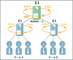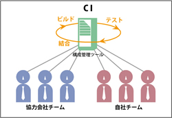 プロジェクト(またはチーム)の各開発者によって作成されたソースコードや、各開発委託会社からの受入れソースコードを定期的にインテグレーションし、問題の早期発見と、品質の向上を実現。