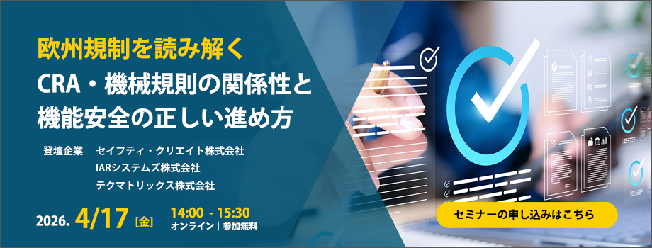 - 2026年4月17日(金)開催!【機能安全セミナー】欧州規制を読み解く:CRA・機械規則の関係性と機能安全の正しい進め方