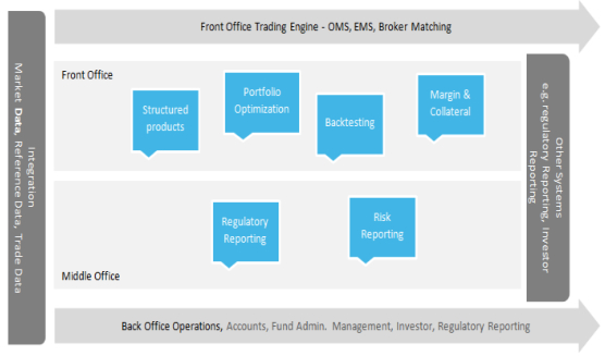 最高クラスのポートフォリオ/リスク分析システムの主な優位点は、企業の既存のトレード/運用ワークフローにしっくりと収まることです。企業は一般的には、下図の上部に示すように、フロントオフィスでOMS(Oreder Management System)/EMS(Execution Management System)を所有し、また下部で示した運用システム、会計システム、および報告システムを所有することになります。上部と下部2つの矢印の間に収まるのがポートフォリオ管理システムとリスクシステムです。このとき企業が下記のニーズに対応するにつれ、単純な状況がより複雑になります。
