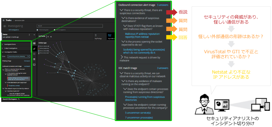 データの収集・脅威検知・レスポンスの一般的なEDR機能に加えて、Trellix EDRでは、検知した脅威の調査、解析を支援する機能ガイドによる調査を提供します。