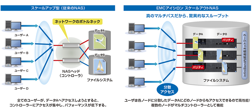 従来のスケールアップ型と呼ばれるNASヘッド+ディスクシェルフのアーキテクチャーでは、NASヘッドの性能がボトルネックになり、ディスク容量とパフォーマンスのバランスを両立することが出来ませんでした。EMCアイシロンのスケールアウト型アーキテクチャーは、NASヘッドとディスクが一体となった「ノード」を複数で構成するクラスタシステムです。追加(スケールアウト)するノード数に比例してディスク容量とパフォーマンスを同時、かつ直線的に拡張することが可能です。