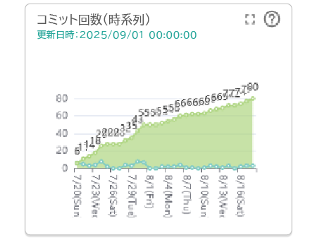 指定期間における、リポジトリへのコミット回数を時系列で表示します。日ごとのコミット回数と累計のコミット回数を知ることができます。