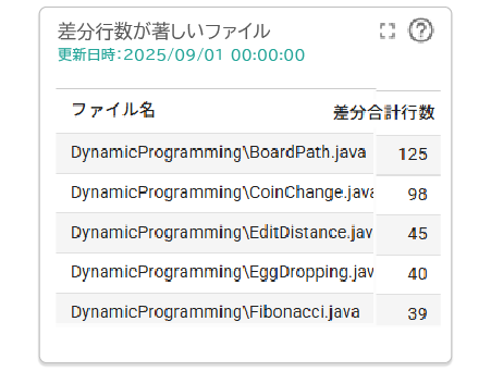指定期間において、コミットが多いファイルを表示します。不自然にコミットが多いファイルがあることに気づくことで潜在的な問題の可能性を知ることができます。