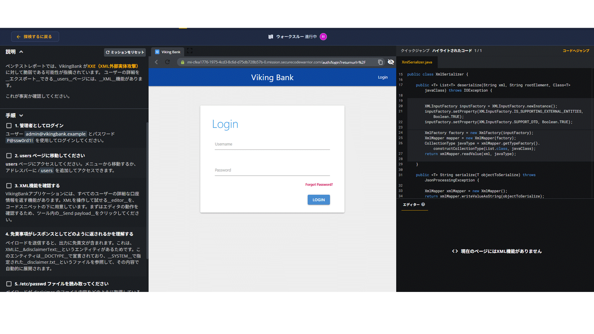 ミッション・ウォークスルーでは、開発者が安全でないコードの影響を体験しながら脆弱性について学びます。ミッション・ウォークスルーには、開発者がアプリケーションを操作し、実際のシナリオで脆弱性がどのように現れるかを体験できるように、明確なステップバイステップの手順が記載されています。主に以下のような流れで学習します。- 画面操作を実際に行い、脆弱性を含むアプリケーションに対して攻撃する