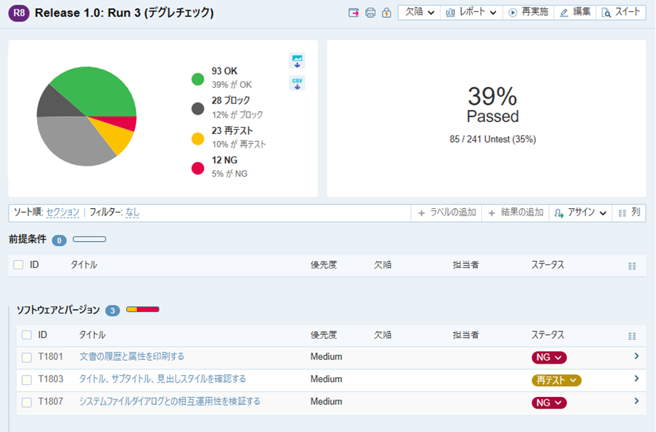 テストの実施や進捗の状況は画面を見るだけで簡単に確認できます。例えばOK/NGといったステータスは色分けで表示されるため、円グラフの割合も視覚的に分かりやすくなっています。またテストの残件もすぐに分かるので、リアルタイムに進捗状況の把握が可能です。