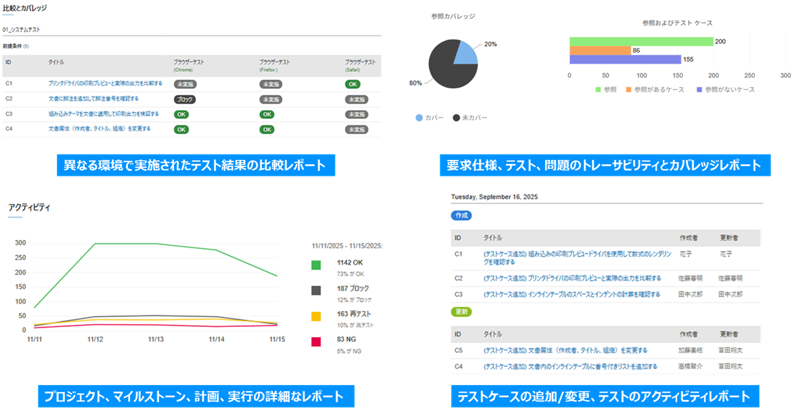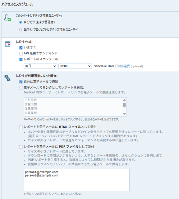 日次や週次、月次など定期的にレポートを自動作成することが可能です。 作成されたレポートを任意のユーザーへのメール送付も可能です。たとえば、 テスト管理者は定期的にレポートを受け取ることで、テスト結果の集計にかかる時間を削減できます。