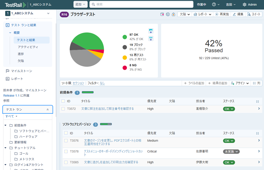 リアルタイムにテスト結果が反映されるため進捗状況の把握が容易です。また、テストに問題があった場合、その場で不具合登録とテスト結果との関連付けができ、追跡も手早くに行えます。