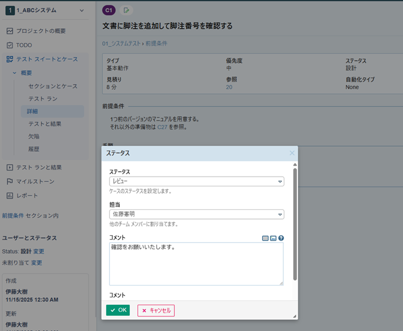 テストケースのステータス変更、担当者アサイン、コメントの追加